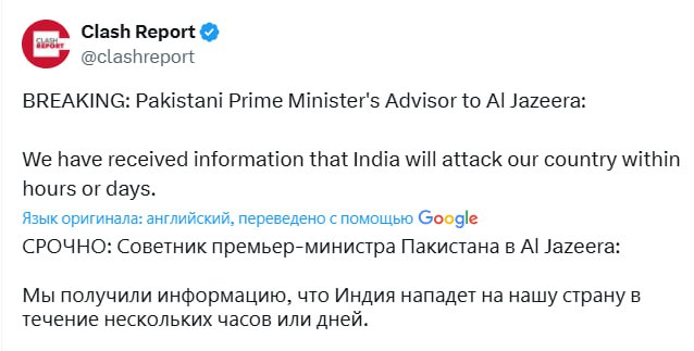 Индия нападет на Пакистан в течение нескольких часов или дней. Об этом заявил советник премьер-министра Пакистана Шахбаза Шарифа телеканалу Al Jazeera.