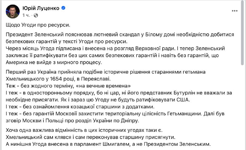 Бывший генеральный прокурор Юрий Луценко сравнил соглашение о недрах с США с Переяславской радой, на которой казаки присягнули на верность российскому царю.
