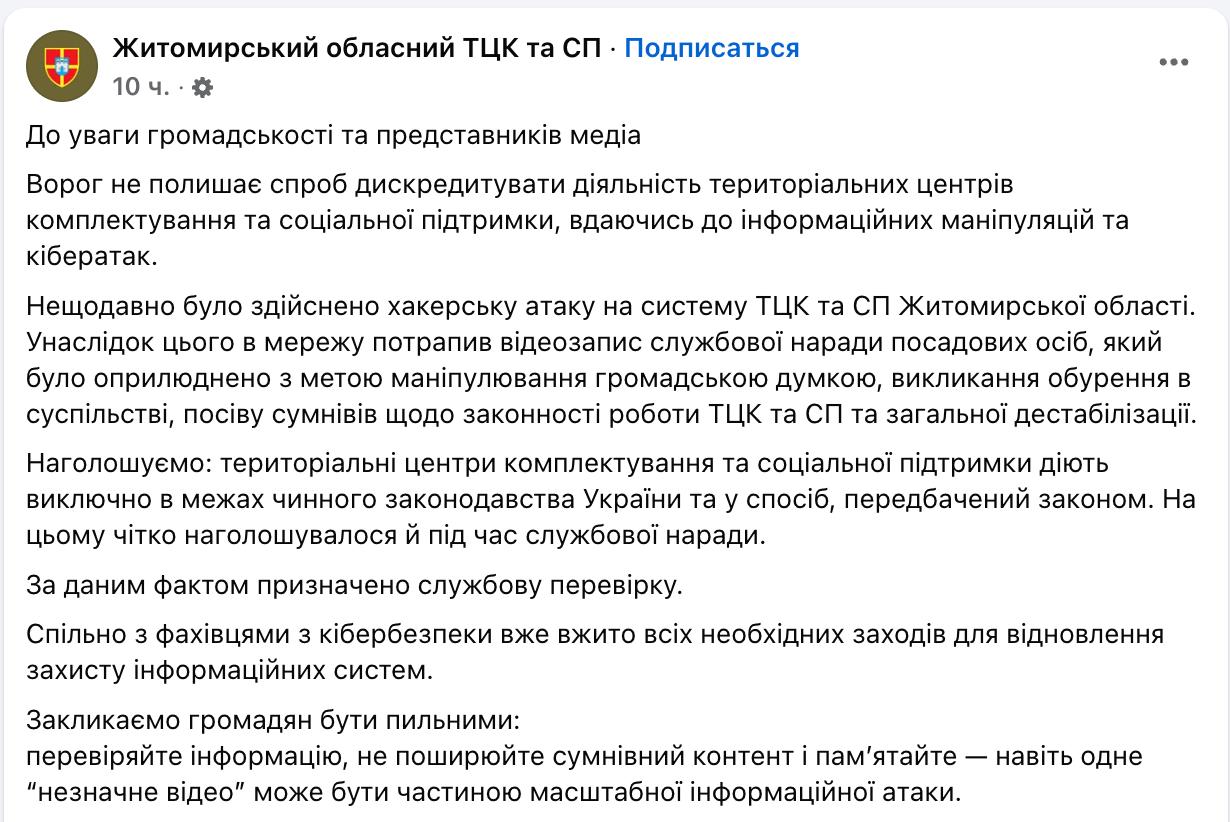 "Недавно была совершена хакерская атака на систему ТЦК и СП Житомирской области. В результате этого в сеть попала видеозапись служебного совещания должностных лиц, которая была обнародована с целью манипулирования общественным мнением", - заявили в облвоенкомате.