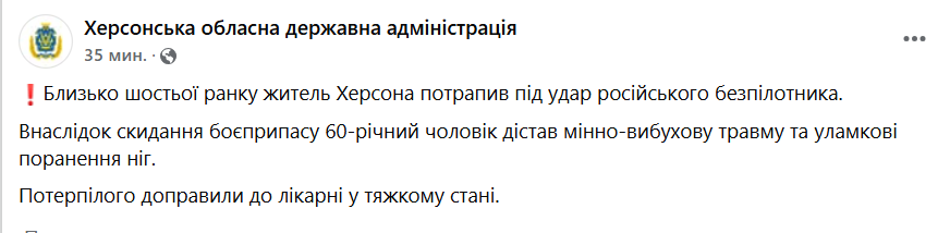"Около шести утра житель Херсона попал под удар российского беспилотника. В результате сброса боеприпаса 60-летний мужчина получил минно-взрывную травму и осколочные ранения ног. Пострадавшего доставили в больницу в тяжелом состоянии", - говорится в сообщении.