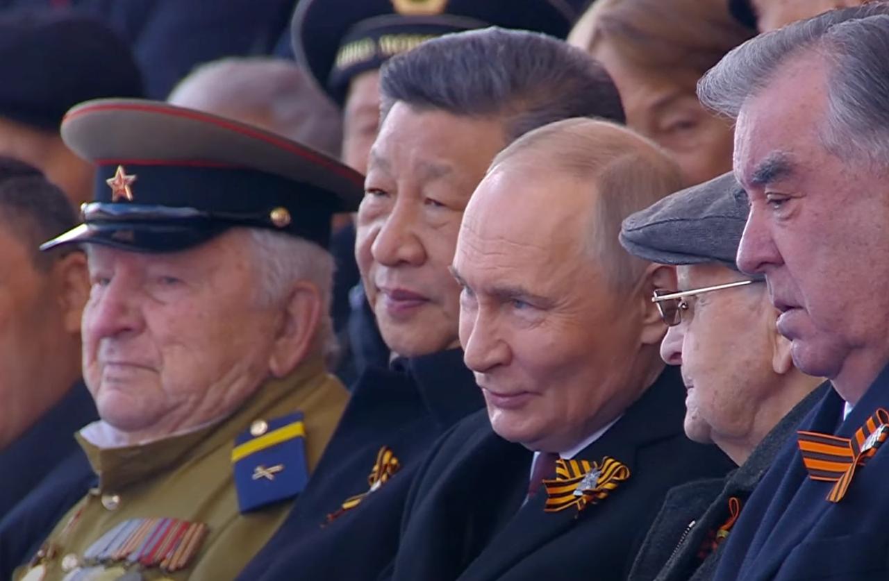 Владимир Путин на трибуне сидел рядом с главой КНР Си Цзиньпином. У китайского лидера на груди георгиевская лента.