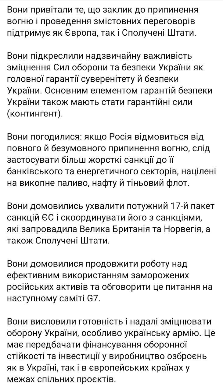 "После встречи коалиции желающих в Киеве все пять лидеров - Владимир Зеленский, Эммануэль Макрон, Фридрих Мерц, Дональд Туск и Кир Стармер - провели конструктивный телефонный разговор с Президентом США Дональдом Трампом по мирным усилиям.