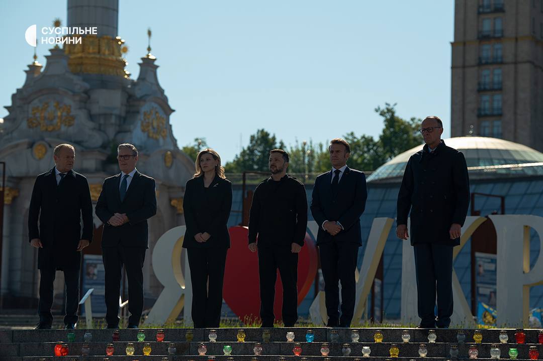 10:41 Лидеры Германии, Франции, Польши и Британия, приехавшие в Киев, встретились с Зеленским и приняли участие в церемонии возложения лампадок к мемориалу погибших в войне в Украине.