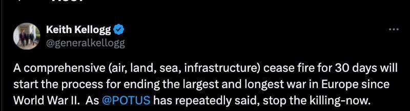 15:48 30-дневное прекращение огня станет началом завершения войны в Украине, заявил спецпредставитель президента США Кит Келлог.