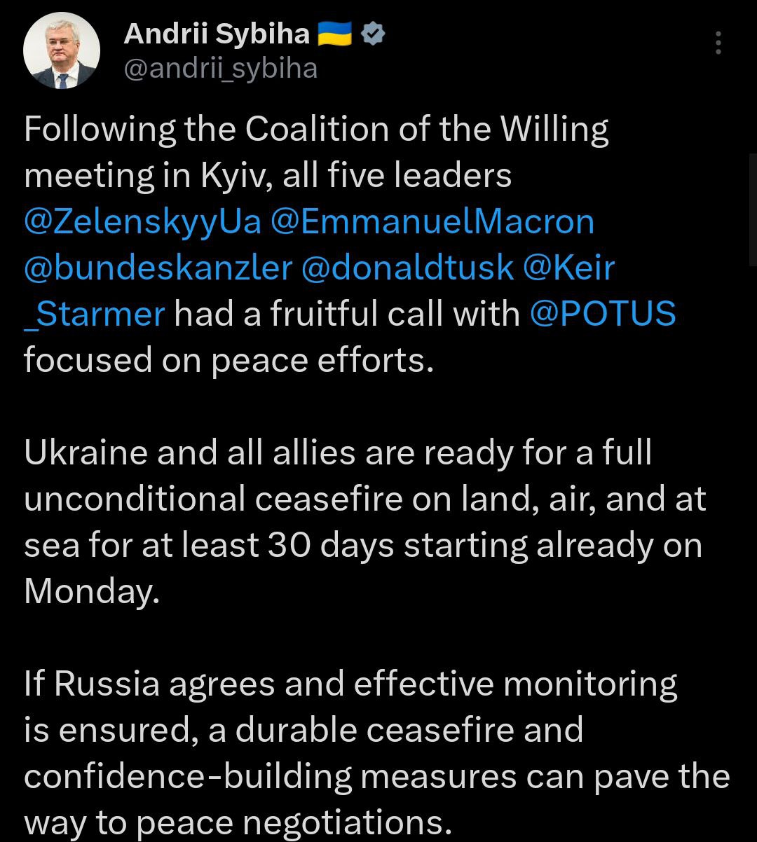 Украина и все союзники готовы к полному безусловному прекращению огня на суше, в воздухе и море по меньшей мере на 30 дней, начиная уже с понедельника.