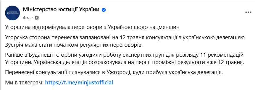 Венгрия перенесла запланированные на 12 мая переговоры с украинской делегацией по правам национальных меньшинств.