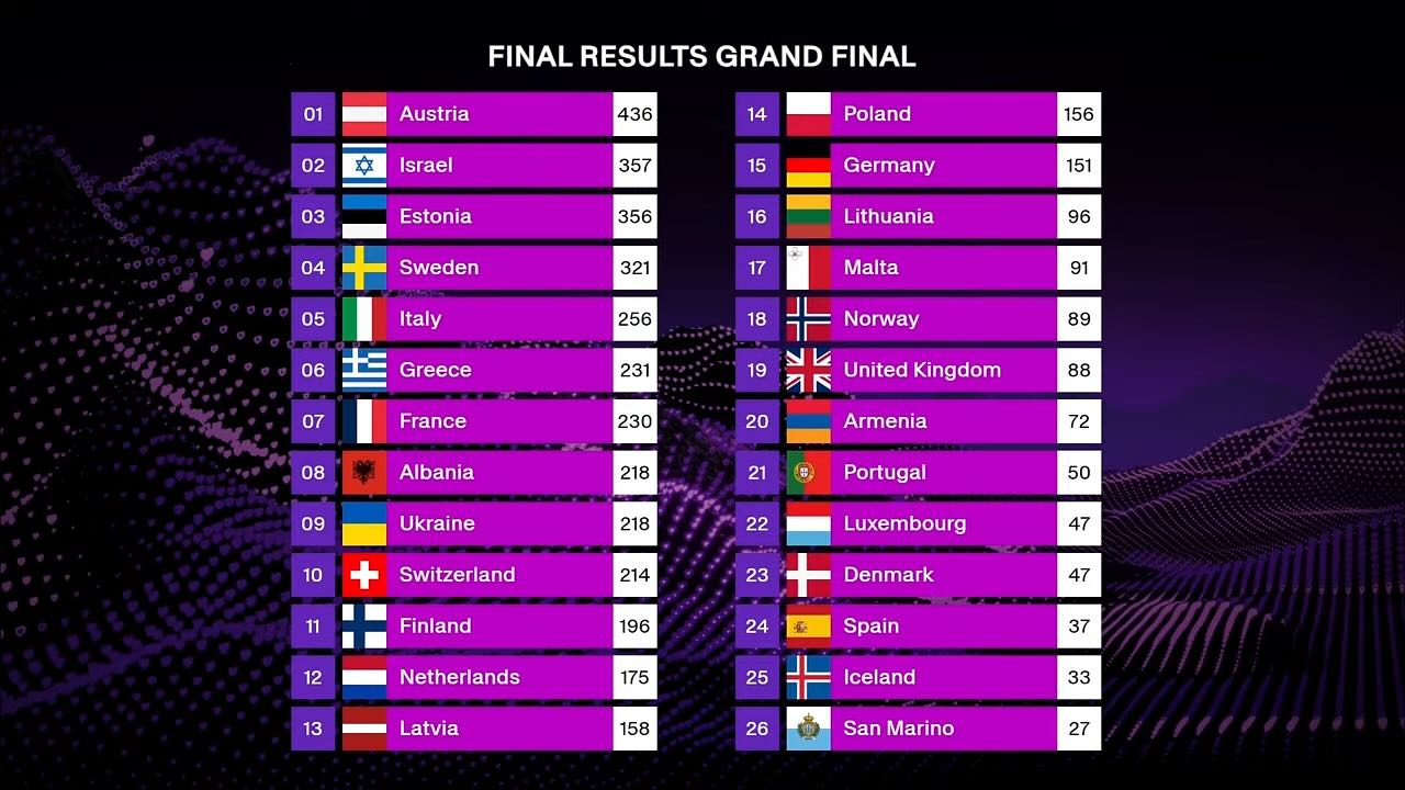 Победитель из Австрии с песней Wasted Love считает себя квиром (лицом, не имеющим традиционной гендерной идентичности). Певец с настоящим именем Йоханнес Пич получил 178 очков от зрителей и 258 от жюри.