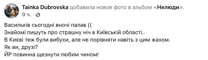 Татьяна Дубровская, волонтёр из столицы, заявила, что сегодня в Киевской области была "страшная ночь".