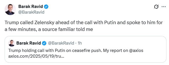 Издание со ссылкой на источник сообщило, что Трамп позвонил Зеленскому перед разговором с Путиным и поговорил с ним несколько минут.