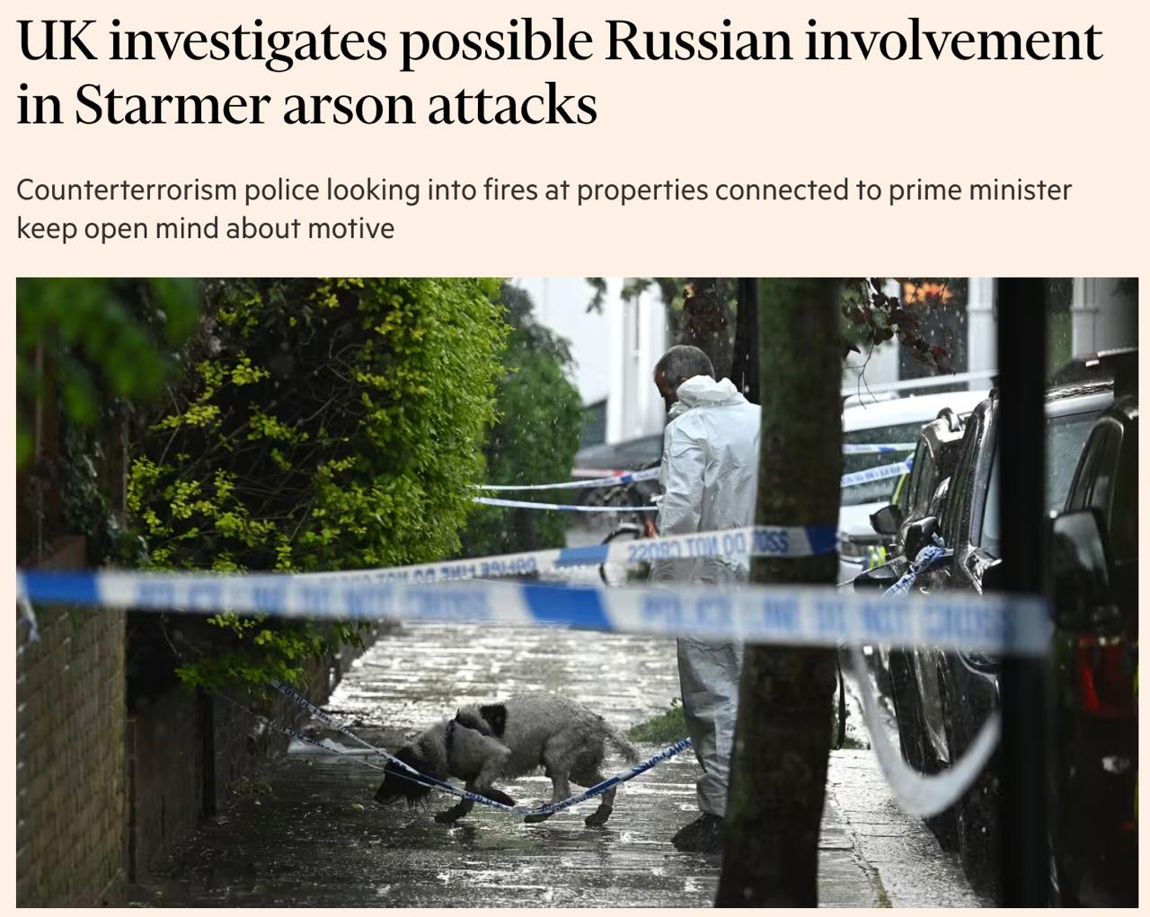"Британские чиновники из сферы безопасности расследуют, была ли Россия вовлечена в… поджоги собственности, связанной со Стармером", - говорится в сообщении.