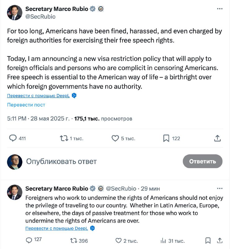 А Рубио написал в Х, что США ограничат выдачу виз иностранным чиновникам, "которые замешаны в цензурировании американцев".