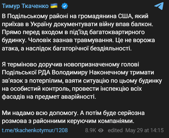 "В Подольском районе на гражданина США, приехавшего в Украину документировать войну, упал балкон. Прямо перед входом в подъезд многоквартирного дома. Мужчина получил травмирование. Это не враждебная атака, а следствие многолетнего бездействия", - написал он.