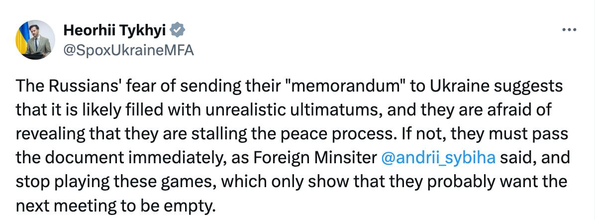 "Боязнь россиян отправить свой "меморандум" в Украину говорит о том, что он, скорее всего, содержит нереалистичные ультиматумы, и они боятся показать, что тормозят мирный процесс. Если это не так, они должны немедленно передать документ и прекратить эти игры, которые показывают, что они, вероятно, хотят, чтобы следующая встреча была пустой", - написал Тихий.