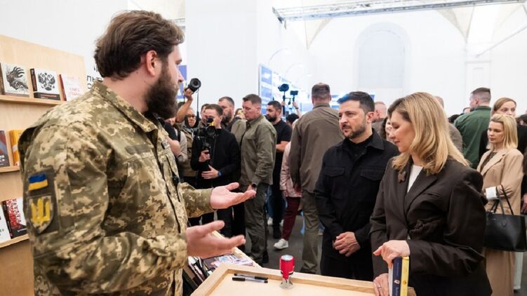 Также в соцсетях опубликована фотография охранников, которые плотно окружили Зеленского на выставке в Киеве "Книжный арсенал". На снимке их не меньше десяти, они взяли в кольцо стенд с книгами, у которого остановились Зеленский и его жена Елена. За фигурами охраны их почти не видно.