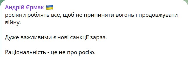 "Россияне делают все, чтобы не прекращать огонь и продолжать войну. Очень важны новые санкции сейчас. Рациональность – это не о России", – заявил глава Офиса президента.