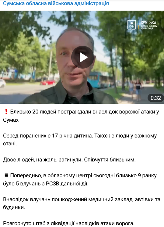 Утром российские военные обстреляли центр города Сумы из ракетных систем залпового огня (РСЗО) дальнего действия. Погибли два человека, ранены около 20 человек.