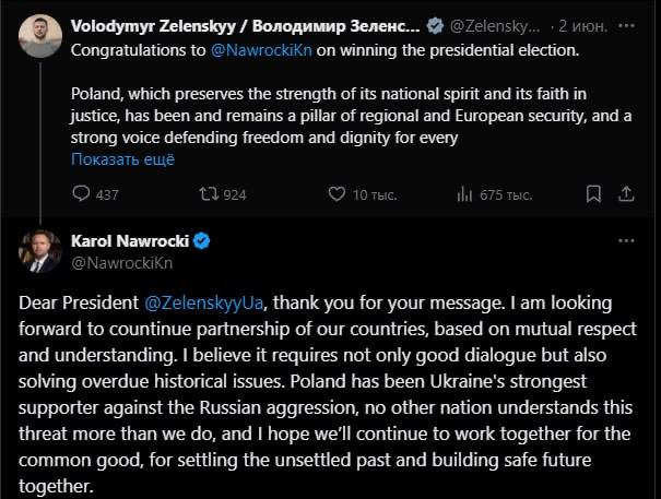 "Я с нетерпением жду продолжения партнерства между нашими странами, основанного на взаимном уважении и понимании. Я считаю, что для этого необходим не только конструктивный диалог, но и решение давно назревших исторических вопросов. Польша является самым сильным сторонником Украины в борьбе с российской агрессией, ни одна другая страна не понимает эту угрозу лучше нас, и я надеюсь, что мы продолжим работать вместе на общее благо для урегулирования нерешенных вопросов прошлого и построения безопасного будущего вместе", - написал Навроцкий.
