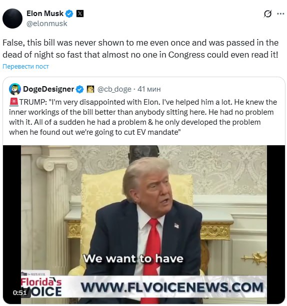 Напомним, Маск резко раскритиковал новый законопроект Трампа о государственных расходах.