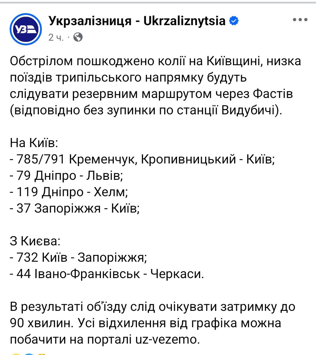 Также повреждены пути на перегоне в районе станции Выдубичи, что вызвало изменения в маршрутах ряда поездов Трипольского направления. Составы следуют в объезд через Фастов без остановки на Выдубичах.