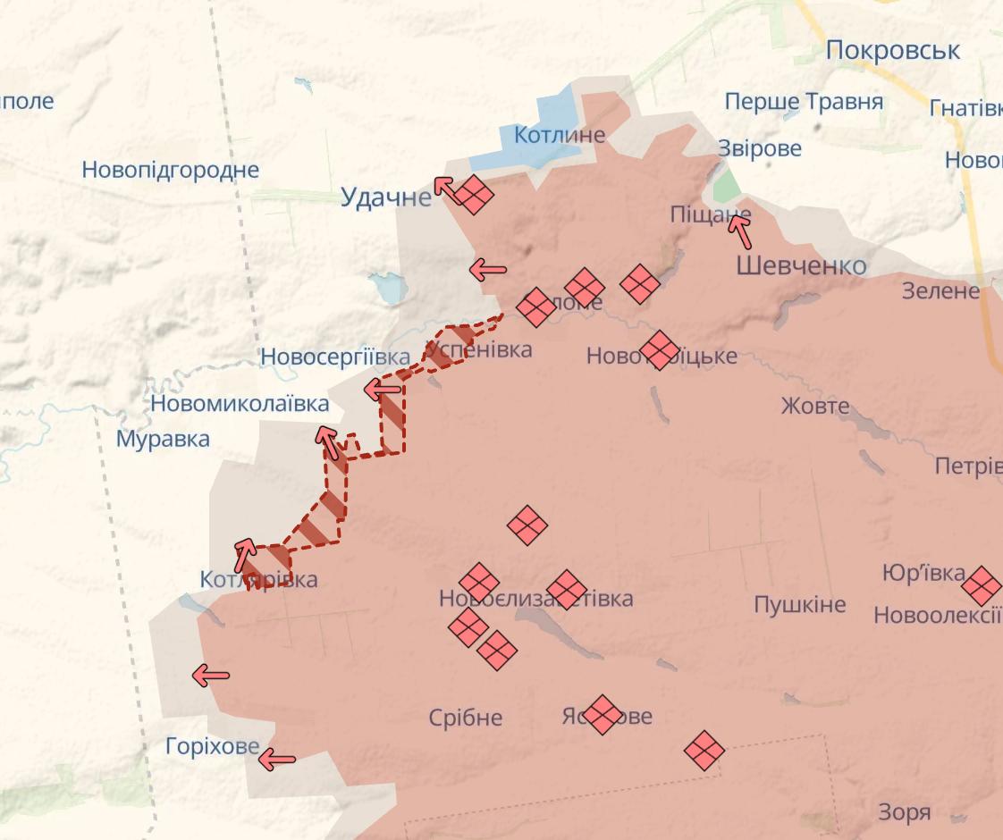 DeepState отмечает, что ситуация на направлении остаётся тяжелой: населенные пункты Кондратовка и Алексеевка полностью контролируются противником, который накапливает там пехоту и продолжает попытки продвинуться вглубь территории.
