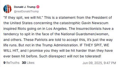 "Это заявление в связи с катастрофическими беспорядками в Лос-Анджелесе, вдохновленными Гэвином Ньюсомом. Участники мятежа имеют тенденцию плевать в лицо солдатам Национальной гвардии – мужчинам и женщинам – и другим. Этим патриотам говорят, что им нужно это терпеть, мол, так устроена жизнь. Но не при администрации Трампа. Если они плюнут – мы ударим, и я обещаю вам, что ударим их сильнее, чем их когда-либо били раньше. Такое неуважение не будет терпимо!" – написал президент США.