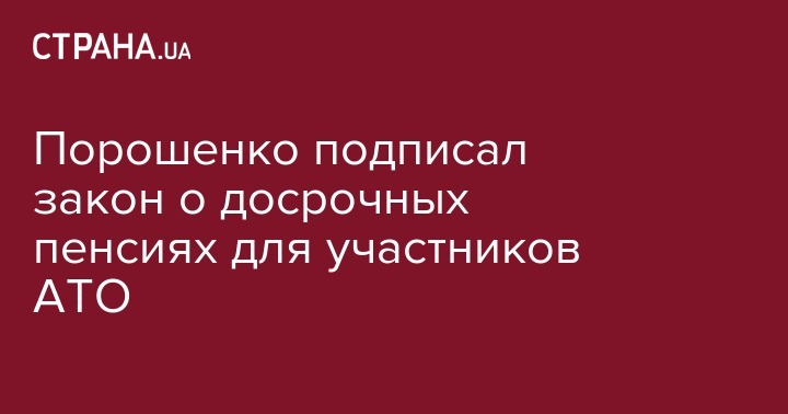 Президент Порошенко подписал закон, которым регулируется досрочный выход на пенсию участникам АТО в Украине. Об этом сообщает пресс-служба главы государства.