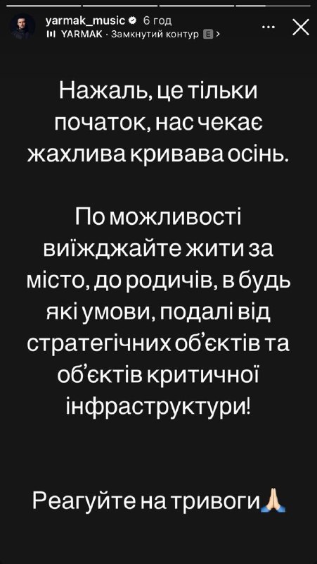"К сожалению, это только начало, нас ждет ужасная кровавая осень. По возможности уезжайте жить за город, к родственникам, в любые условия, подальше от стратегических объектов и объектов критической инфраструктуры!" - написал Ярмак.