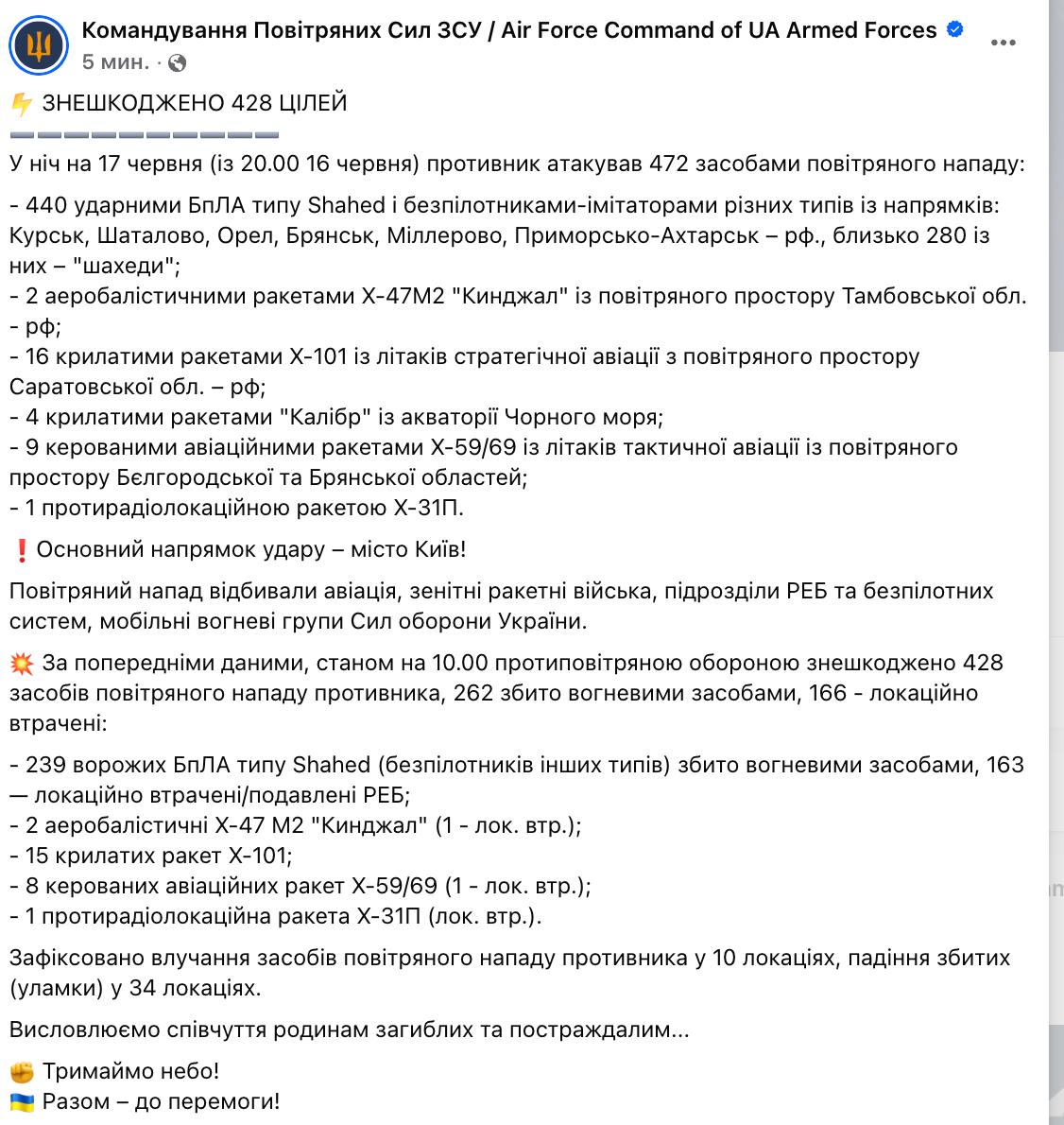 Также было запущено 440 БпЛА Shahed и имитаторов, 239 сбиты, 163 "локационно потеряны".
