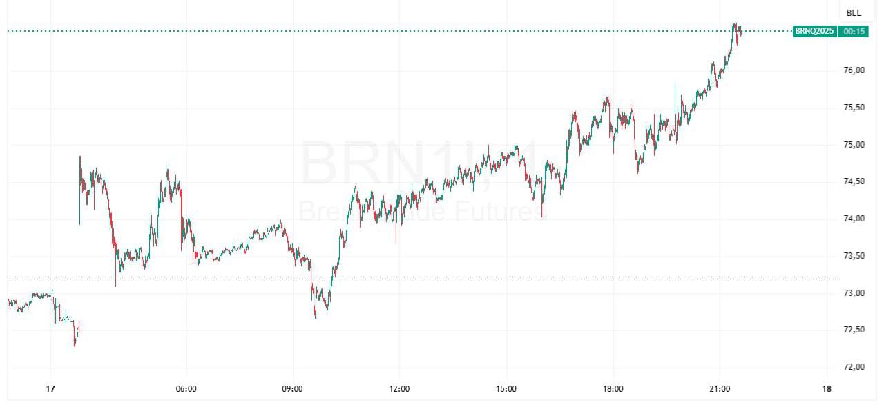 Стоимость августовских фьючерсов на нефть Brent на лондонской бирже ICE Futures выросла на пике в 21:26 по Киеву на 4,62% и поднялась до $76,62 за баррель. К 21:34 рост замедлился до 4,54%, котировки откатились к $76,56 за баррель.