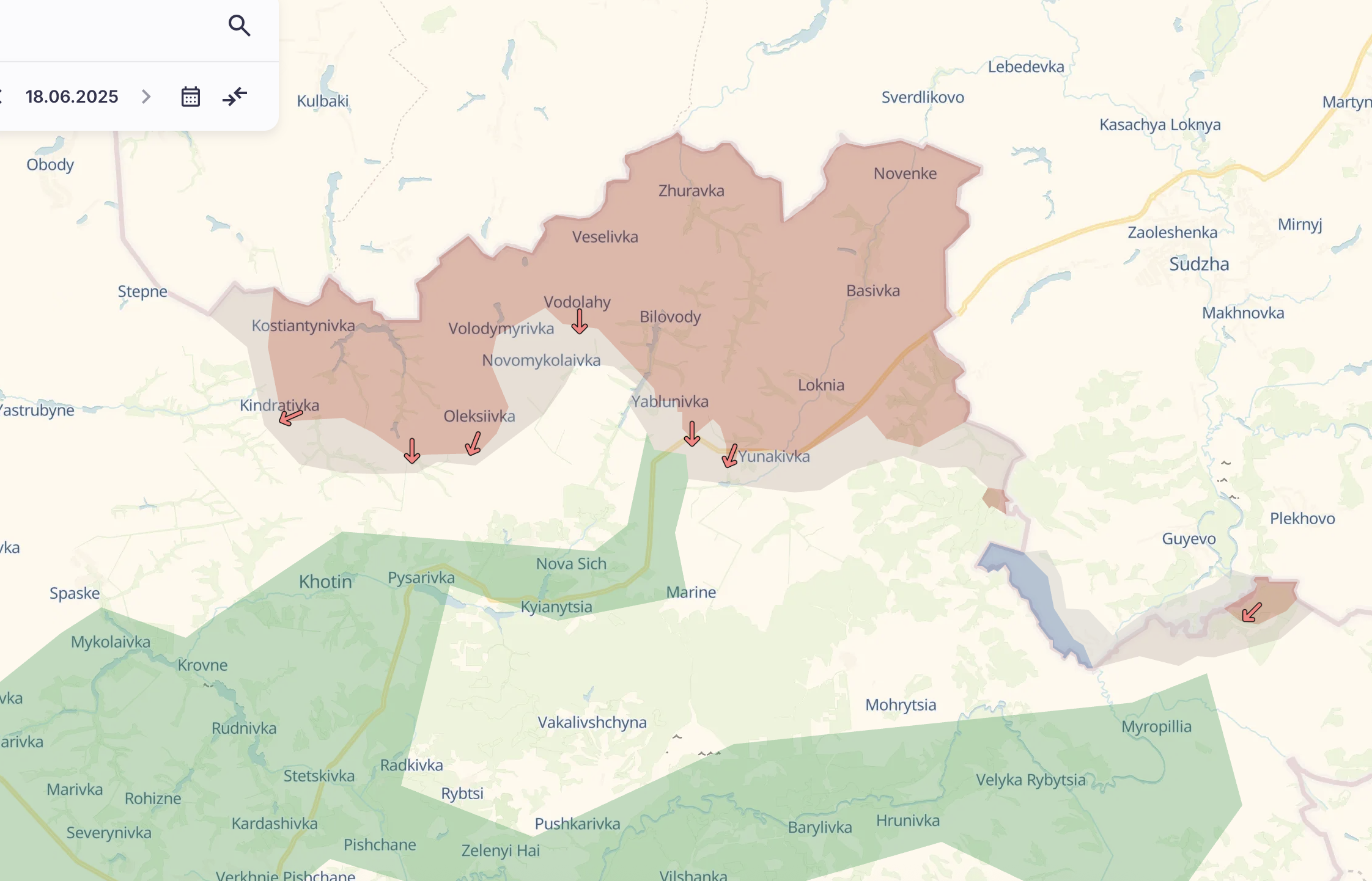 По мнению эксперта, ближайшей задачей РФ является выход на линию Малая Корчаковка – Новая Сечь – Марьинка – Садки. Основные усилия сейчас сосредоточены в районе Юнаковки и по линии Алексеевка – Андреевка. Вероятной целью является продвижение к северным окраинам крупного лесного массива, расположенного северо-восточнее Сум.