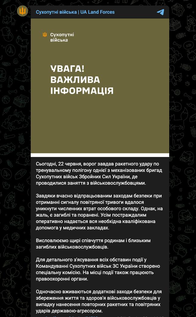 17:23 22 июня российские войска нанесли ракетный удар по учебному полигону одной из механизированных бригад ВСУ, где проходили занятия с личным составом.