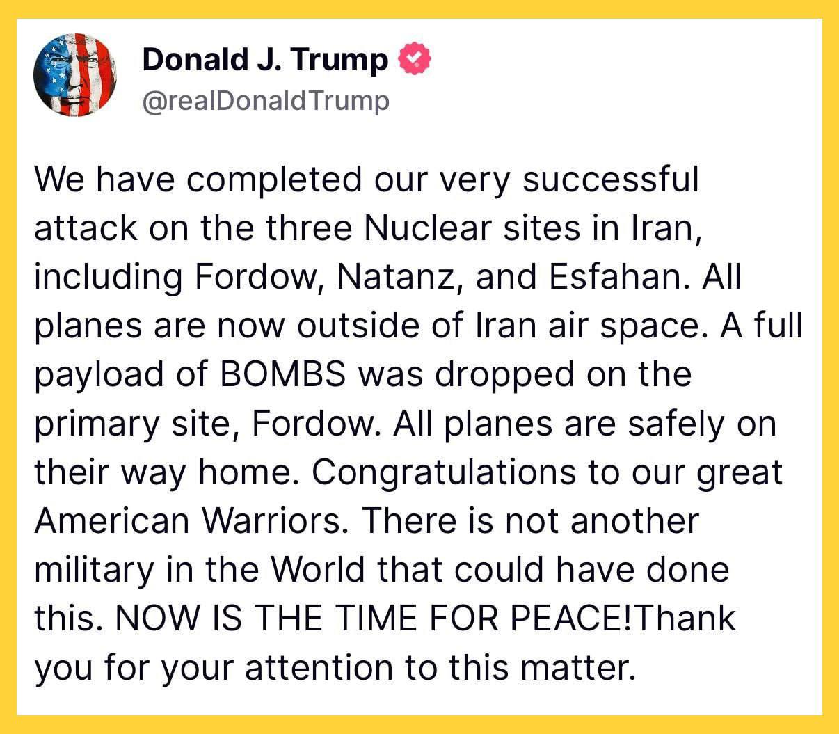 "Все самолеты уже покинули воздушное пространство Ирана. Полный боекомплект был сброшен на основную цель – Фордо", - заявил Трамп.