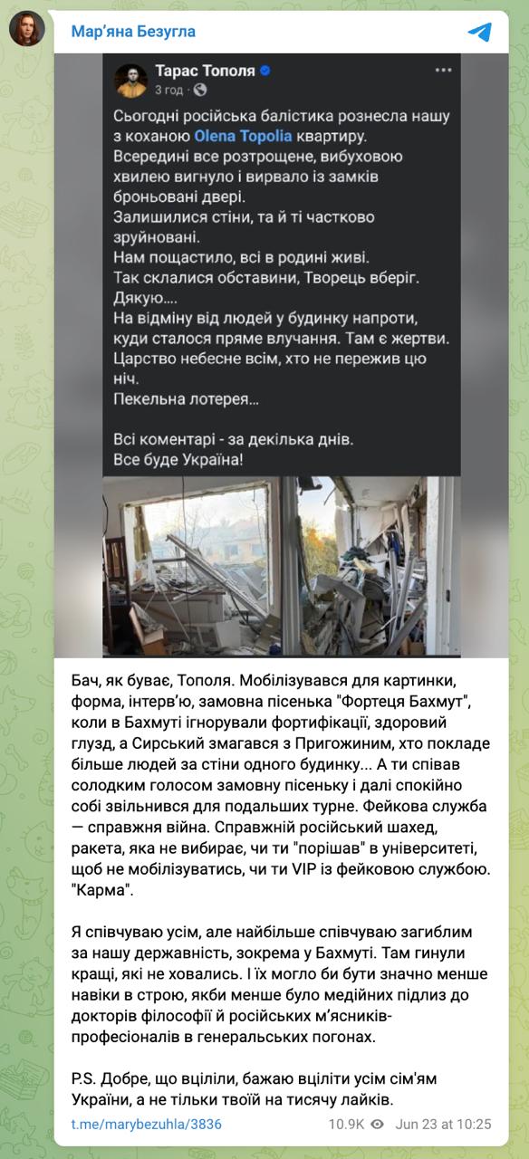 "Видишь, как бывает, Тополя. Мобилизовался для картинки, форма, интервью, заказная песенка "Фортеця Бахмут", когда в Бахмуте игнорировали фортификации, здравый смысл, а Сырский соревновался с Пригожиным, кто положит больше людей за стены одного дома... А ты пел сладким голосом заказную песенку и дальше спокойно уволился для дальнейших турне. Фейковая служба — настоящая война. Настоящий российский "Шахед", ракета, которая не выбирает, или ты "порешал" в университете, чтобы не мобилизоваться, или ты VIP с фейковой службой. Карма", - написала Безуглая.