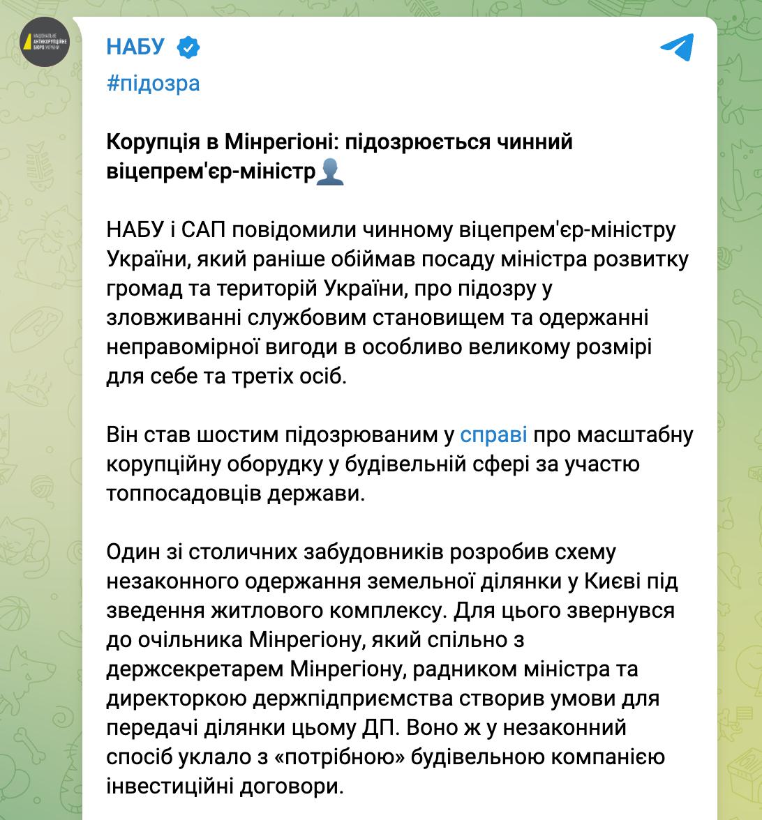 Национальное антикоррупционное бюро Украины (НАБУ) официально сообщило о подозрении вице-премьеру и министру национального единства Украины Алексею Чернышову, который вернулся в Украину в воскресенье.