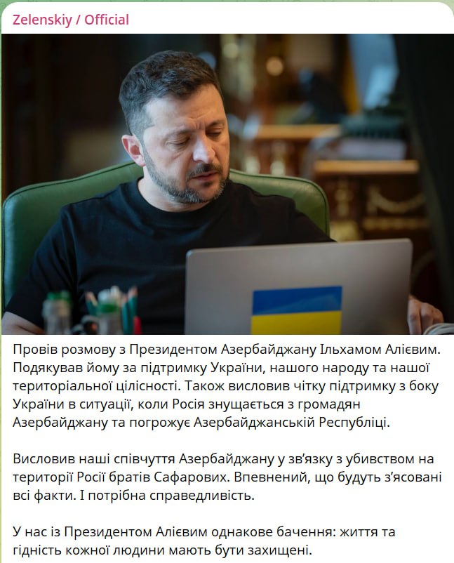 "Выразил четкую поддержку со стороны Украины в ситуации, когда Россия издевается над гражданами Азербайджана и угрожает Азербайджанской Республике. Выразил наши соболезнования Азербайджану в связи с убийством на территории России братьев Сафаровых", – написал Зеленский.