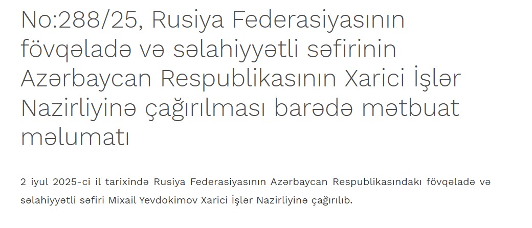Азербайджанский МИД вызвал российского посла Михаила Евдокимова, чтобы выразить ему "протест в связи с недружественными действиями и шагами российской стороны, наносящими ущерб отношениям между двумя странами".