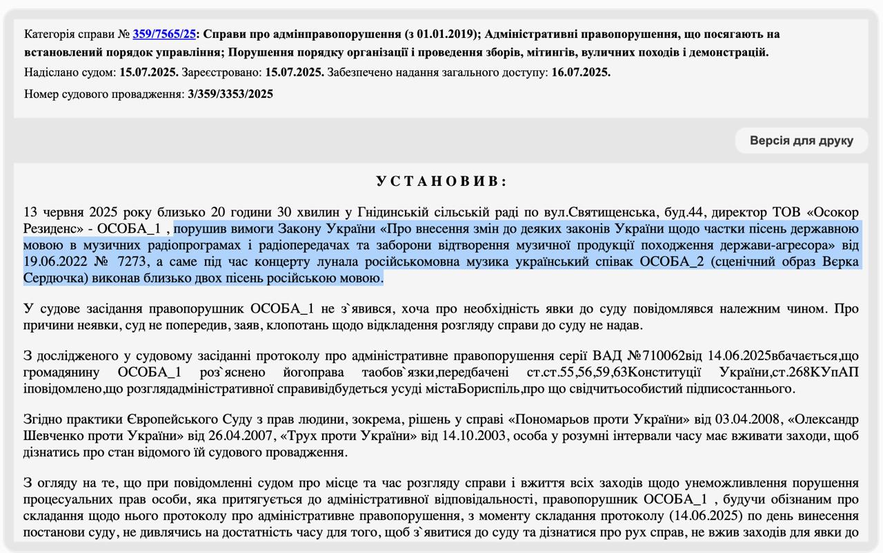 Предпринимателя признали виновным в нарушении языкового законодательства в ходе концерта 13 июня. Также он должен уплатить судебный сбор в 605 грн.
