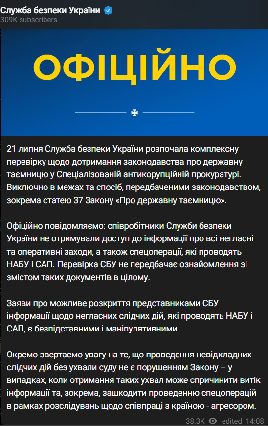 СБУ подтверждает, что сегодняшние обыски у НАБУ и САП проводит без решения суда. Объясняет это тем, что данные меры являются неотложными, а потому не запрещены законом.