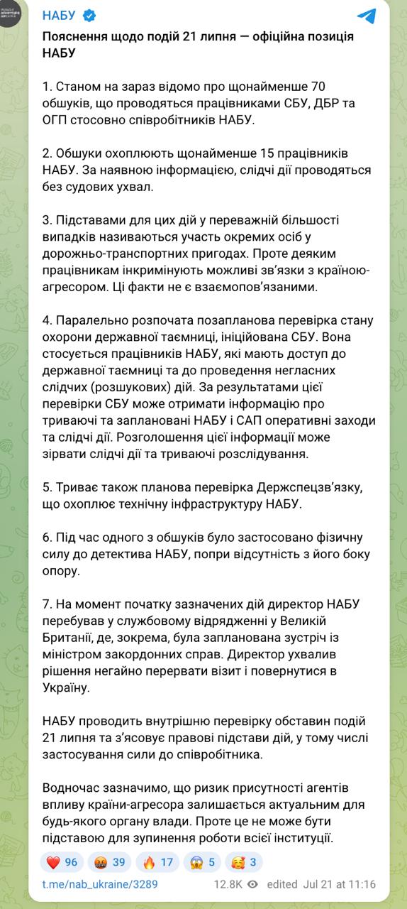 СБУ, ГБР и прокуратура проводят не менее 70 обысков у как минимум 15 сотрудников НАБУ, сообщает Бюро.