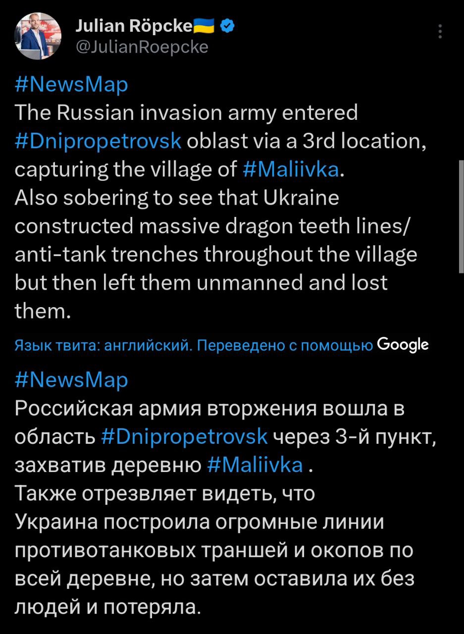Также военный корреспондент немецкой газеты Bild Юлиан Рёпке пишет, что российские войска вошли в Днепропетровскую область через третий участок и заняли село Малиевка.