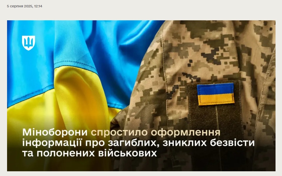 Министерство обороны Украины в рамках усовершенствования системы защиты прав военнослужащих и их семей упростило документальное оформление случаев смерти и гибели, захвата в плен, пропажи без вести военных во время боевых действий.