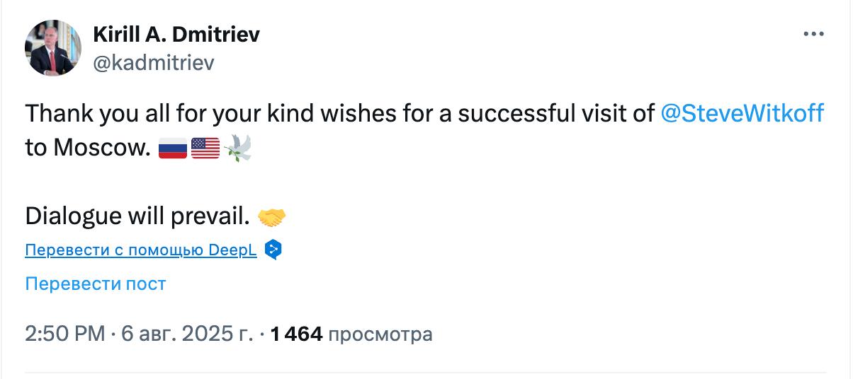 "Спасибо всем за добрые пожелания успешного визита Стива Уиткоффа в Москву. Диалог возобладает", - написал Дмитриев в Х после завершения переговоров.