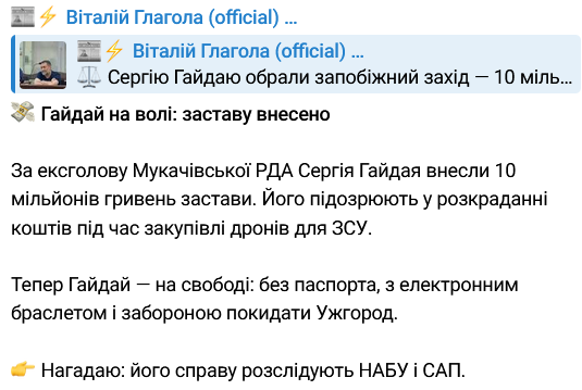 "Теперь Гайдай на свободе: без паспорта, с электронным браслетом и запретом покидать Ужгород", - написал журналист.