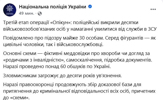 Сотрудники полиции, ГБР и внутренней безопасности ВСУ сообщили о подозрении почти 30 лицам, подозреваемым в уклонении от службы - как гражданским, так и военным, а также провели более 60 обысков по всей территории страны.