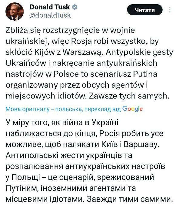 "Развязка украинской войны близка, поэтому Россия делает всё, чтобы поссорить Киев с Варшавой. Антипольские жесты украинцев и нагнетание антиукраинских настроений в Польше — это сценарий Путина, организованный иностранными агентами и местными глупцами. Всегда одни и те же", - написал Туск.