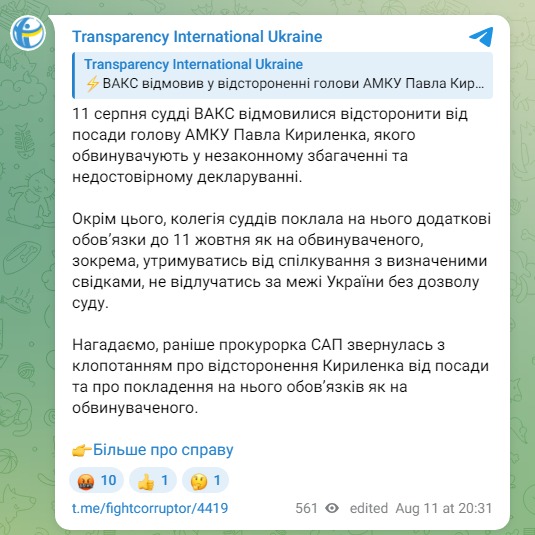 Об этом сообщает в своем телеграм-канале организация Transparency International Ukraine.