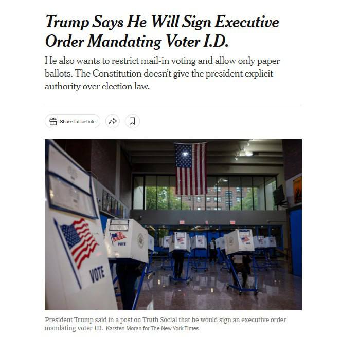 "Айди избирателя должен быть частью каждого голосования. Без исключений! Вскоре я опубликую соответствующий указ", - написал Трамп.