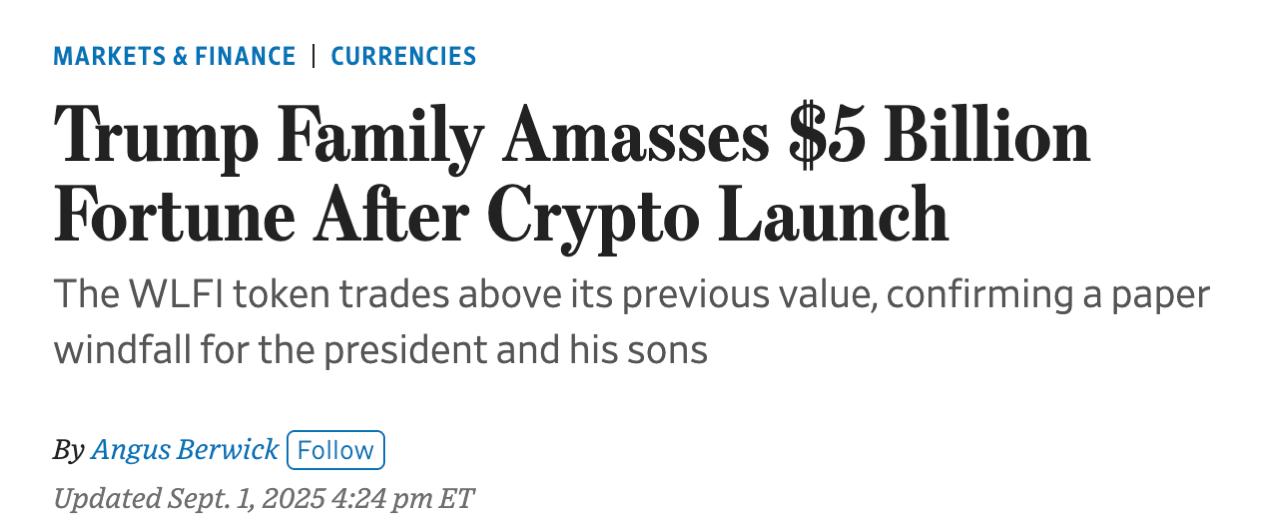 Вчера семья президента США Дональда Трампа заработала около пяти миллиардов долларов на открытии торгов своей новой цифровой валютой WLFI. Вероятно, это было крупнейшим финансовым успехом семьи президента с момента его инаугурации.