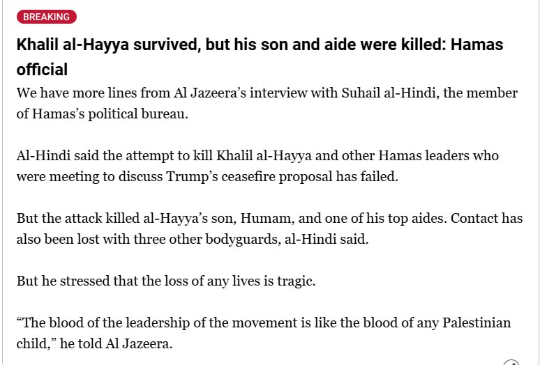 Ранее телеканал Al Jazeera со ссылкой на официального представителя движения ХАМАС сообщил, что в результате удара Израиля по Дохе погиб сын лидера ХАМАС в секторе Газа Халиля аль-Хайи.