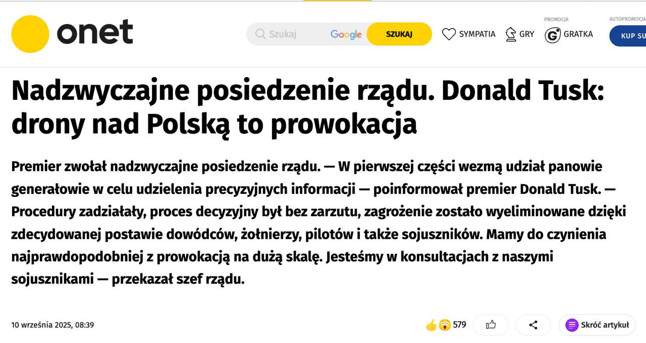 "Это первый случай уничтожения российских беспилотников над территорией страны НАТО. Все наши союзники относятся к ситуации очень серьёзно. Мы не зафиксировали никаких потерь. Поиски обломков сбитых беспилотников продолжаются. Процедуры были отработаны, процесс принятия решений был безупречным, и угроза была устранена благодаря решительным действиям командиров, солдат, пилотов и даже союзников. Скорее всего, мы имеем дело с масштабной провокацией. Мы консультируемся с нашими союзниками", — передает польское издание Onet слова премьера.